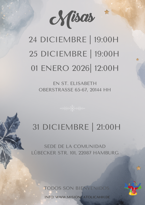 BIENVENIDOSSomos la comunidad católica en idioma español de la Arquidiócesis de Hamburgo, como tal, damos la más cordial bienvenida a cuantos visiten nuestra página web. Al explorar este sitio encontrarán información en relación con nuestros grupos y actividades. Gracias por visitarnos! Misas navidad, fin y comienzo de añoENVÍO MISIONERO P. OSCAR |