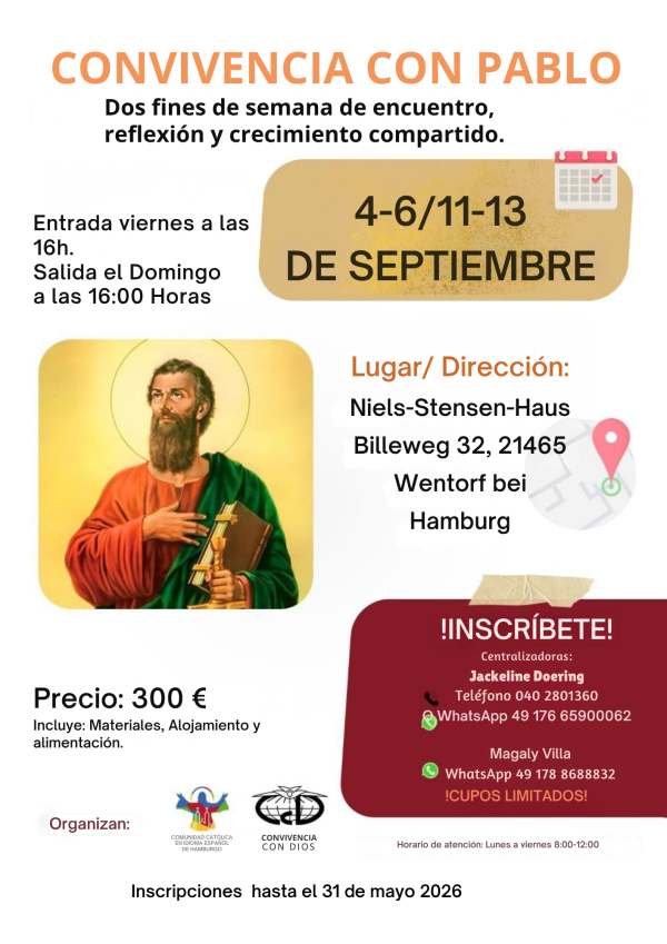 ActualidadesEl P. Darío atiende confesiones en los siguientes días y horarios. Se recomienda llamar previamente para programar su cita.: Media hora antes de las Misas de los domingos, los miércoles de Cuaresma de las 16 a 18hs. y los viernes de 17 a 19hs., en la sede. El párroco Dario no estará para la semana del 10 al 17 de marzo confesando en la sede. GraciasACTIVIDADES DE MARZO 11:15 h. St. Bonifatius Wilh. Procesión comienza en el Hospital Groß-Sand 17:15 h. St. Elisabeth. Procesión comienza en Innocentiapark Jueve Santo: 02.04 19h. Misa en la sede y Adoración a la eucaristía hasta las 24h Viernes Santo: 03.04 14 h. Vía Crucis familiar. (parqueadero Spielplatz Stader Str. - Harburg) 18h. Celebración de la Pasión de Cristo en St Bonifatius Wilh. Vigilia Pascual: 04.04 (traer el agua para bendecir por favor). 18h. St. Bonifatius Wilh. Domingo de Resurrección:05.04. 11:30 h. St. Bonifatius Wilh. 17:30 h. St. Elisabeth. SALUDO DEL P. DARIO BRANDT PROYECTO PADRE OSCAR EN POZO AZUL PROYECTO PADRE OSCAR EN POZO AZUL Evangelio del día Porqué se pagan impuestos a la Iglesia Información sobre el impuesto a la Iglesia en Alemania Católicos en Hamburgo |