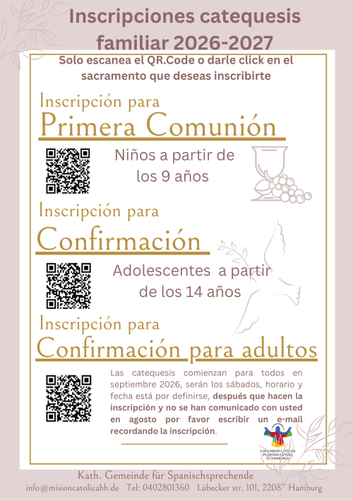 BIENVENIDOSSomos la comunidad católica en idioma español de la Arquidiócesis de Hamburgo, como tal, damos la más cordial bienvenida a cuantos visiten nuestra página web. Al explorar este sitio encontrarán información en relación con nuestros grupos y actividades. Gracias por visitarnos! VIERNES DE CUARESMA |