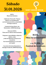 ActualidadesLos miércoles no se celebrará misa en el sede, por el mes de enero. gracias por su comprensión. ACTIVIDADES DE ENERO MISA DE LAS NACIONES Y FESTIVAL DE LA CULTURA Misa de las Naciones. 18:15.h. Celebrante: Decano Dr. Thomas Benner en concelebración con los hermanos de las comunidades de lengua materna. Catedral de Santa María, Am Mariendom 1, 20099 Hamburgo. Hacia las 19:30 h. Fiesta de las culturas internacionales Programa: especialidades culinarias, música, canto y baile de diferentes culturas en la Casa de los Servicios Eclesiásticos y en la sala parroquial. Casa de los Servicios Eclesiásticos, Danziger Straße 64, 20099 Hamburgo SALUDO DEL P. DARIO BRANDT PROYECTO PADRE OSCAR EN POZO AZUL PROYECTO PADRE OSCAR EN POZO AZUL Toma de Posesión del P. Dario. Evangelio del día Porqué se pagan impuestos a la Iglesia Información sobre el impuesto a la Iglesia en Alemania Católicos en Hamburgo |